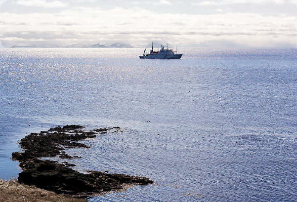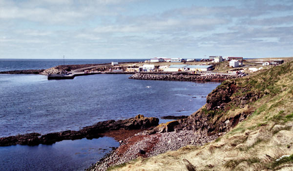![]() Approaching Grimsey - bird cliffs on the left, settlement on the right |