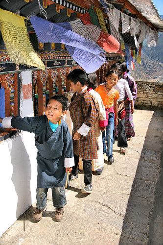 ![]() Children operating a line of prayer wheels at Drakha Dzong |