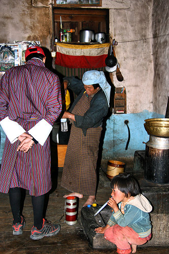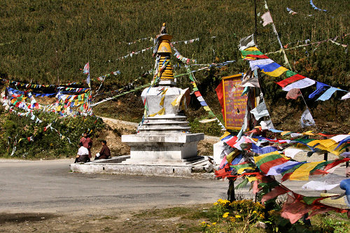![]() The traditional chorten and prayer flags are at each mountain pass |