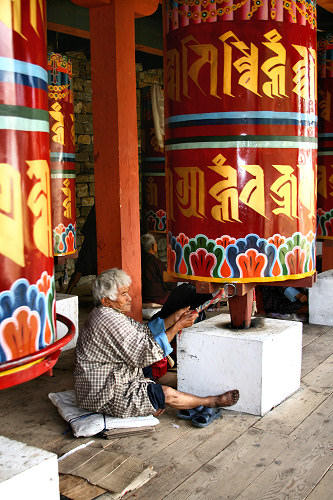 ![]() Sitting down to operate one of the large prayer wheels in the Memorial Chorten complex in central Thimphu | |