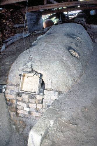 The Anagama kiln is an ancient type of pottery kiln brought to Japan from China via Korea in the 5th century.An anagama (a Japanese term meaning "cave kiln" 穴窯) consists of a firing chamber with a firebox at one end and a flue at the other (note that although the term "firebox" is used to describe the space for the fire, there is no physical structure separating the stoking space from the pottery space). The term Anagama describes single-chamber kilns built in a sloping tunnel shape. In fact, ancient kilns were sometimes built by digging tunnels into banks of clay.