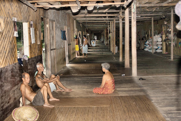 ![]() An Iban tribal "longhouse" - this one consisting of 21 joined family units each of several rooms at the back each opening into one very long family room with a balcony at the front |