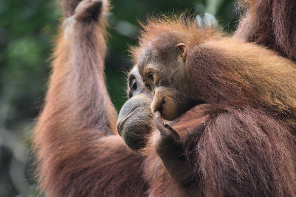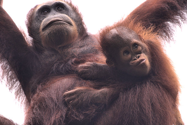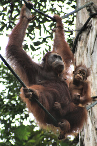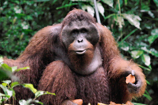 Below: a large lone male - "George" (some distance away in the dark jungle - and it was raining) ![]() |