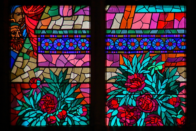 56 Detail of stained glass window, St Vitus Cathedral, Czech Republic |