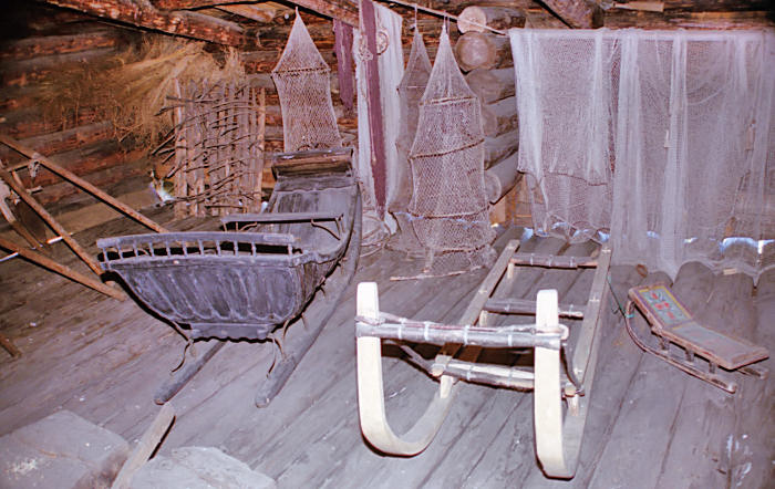 ![]() Fishing nets and sledges in a 19th century house Below: two other rooms in the old house |