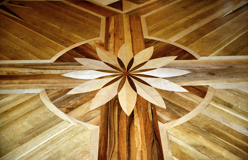 ![]() One of the many patterns in the wooden flooring Below: the rear of the palace (the sunny side) with its chapel, and its extensive gardens |