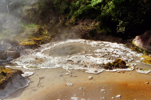 ![]() The volcano Mt. Tarawera in the background blew its side off in 1886 covering the surrounding area in lava and ash. The hole in the side of the volcano can be seen more clearly in the closer views below. |