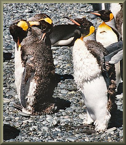 King penguins waiting for their old feathers to moult before they can go to sea to fish again