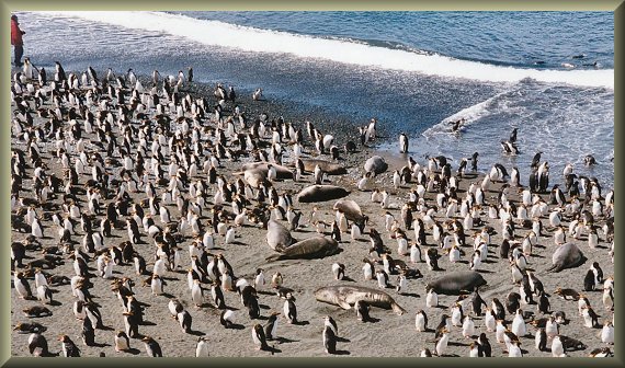 Royal penguins on the beach, with a few King penguins, Southern Elephant seals, and an expeditioner.