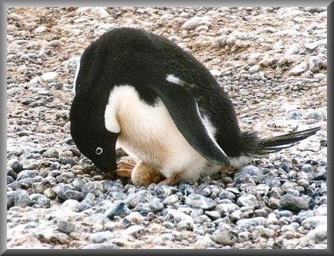 Adelie penguin turning its egg at Cape Adare at the north west point of the Ross Sea