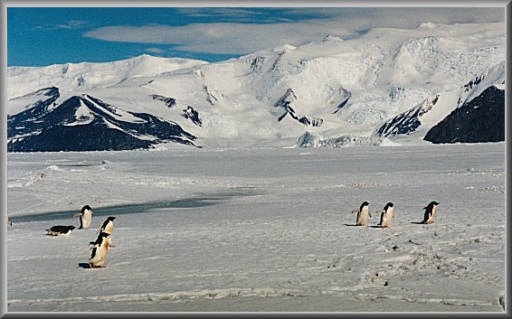 View across the sea ice at the north west coast of the Ross Sea at Cape Adare - with Adelie penguins