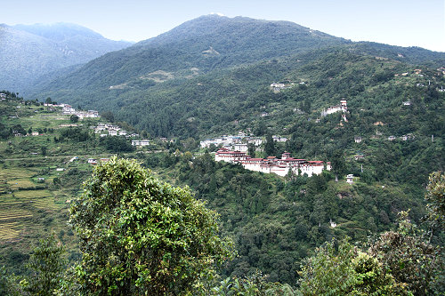 ![]() The setting of the large Trongsa Dzong, with the town immediately behind | |