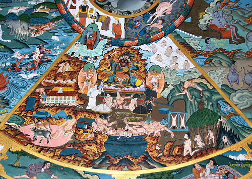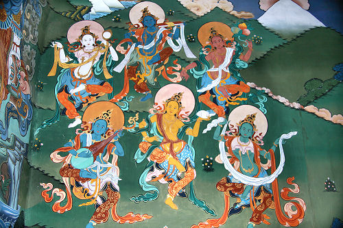 Buddhist paintings to us, while local boys watch with interest (on their way out after blessing) | |