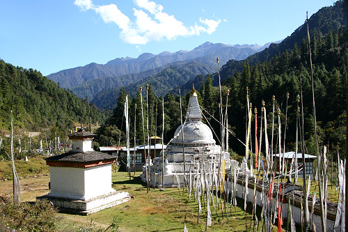 ![]() The traditional chorten and prayer flags are at each mountain pass |