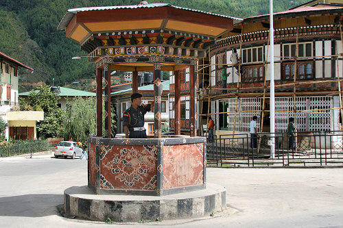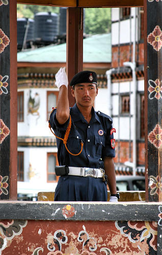 ![]() The crossroads traffic policeman (there are no traffic lights in Bhutan), and below | |