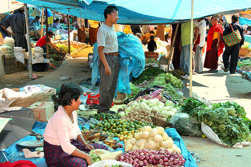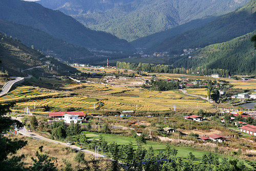 ![]() Rice fields on the outskirts of the town - a typical valley view in Bhutan | |