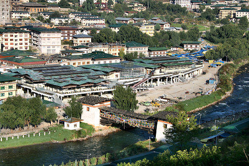 ![]() Traditional bridge in the foreground, with the new market behind (with its array of solar panels); the current Thimphu market has the blue tarpaulins in the middle right | |