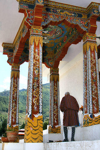 ![]() Sitting down to operate one of the large prayer wheels in the Memorial Chorten complex in central Thimphu | |