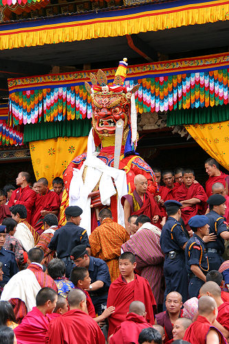 ![]() The giant puppet, Shinje Chhogyel (Lord of Death), sits over the judgement of souls | |