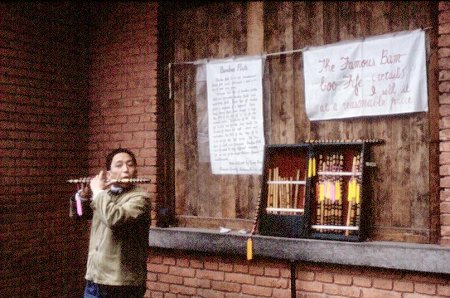 A flute maker demonstrating his products China Map and Menu