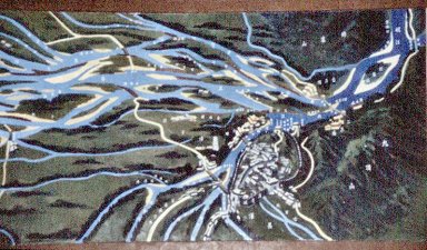 The point where the main diversion is taken (upper middle) from the original river (going from right to left in the lower part of the picture) |