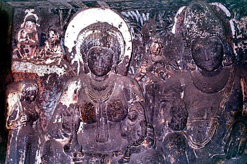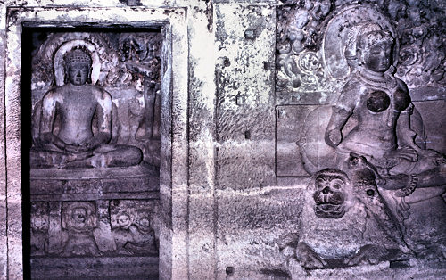 ![]() Buddhist cave at Ellora - 6th century ![]() Sculpture of Buddha in the cave |
