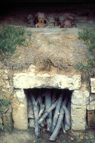 Burning wood not only produces heat � up to 2,500 �F (1400 �C) � it also produces fly ash and volatile salts. Wood ash settles on the pieces during the firing, and the complex interaction between flame, ash, and the minerals comprising the clay body forms a natural ash glaze. This glaze may show great variation in color, texture, and thickness, ranging from smooth and glossy to rough and sharp. The placement of pieces within the kiln distinctly affects the pottery's appearance, as pieces closer to the firebox may receive heavy coats of ash, or even be immersed in embers, while others deeper in the kiln may only be softly touched by ash effects. Other factors that depend on the location include temperature and oxidation/reduction. Besides location in the kiln, (as with other fuel fired updraft kilns) the way pieces are placed near each other affects the flame path and thus, the appearance of pieces within localized zones of the kiln can vary as well. It is said that loading an anagama kiln is the most difficult part of the firing. The potter must imagine the flame path as it rushes through the kiln, and use this sense to paint the pieces with fire.