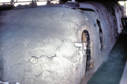 The Anagama kiln is an ancient type of pottery kiln brought to Japan from China via Korea in the 5th century.An anagama (a Japanese term meaning "cave kiln" 穴窯) consists of a firing chamber with a firebox at one end and a flue at the other (note that although the term "firebox" is used to describe the space for the fire, there is no physical structure separating the stoking space from the pottery space). The term Anagama describes single-chamber kilns built in a sloping tunnel shape. In fact, ancient kilns were sometimes built by digging tunnels into banks of clay.