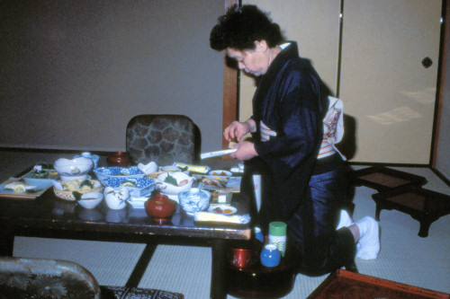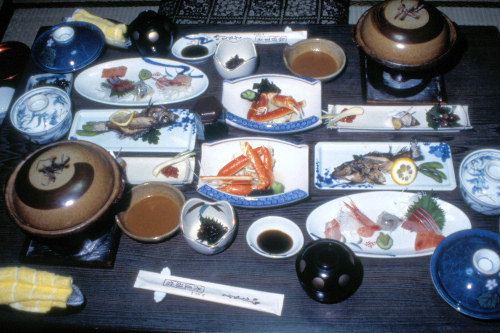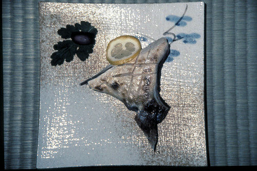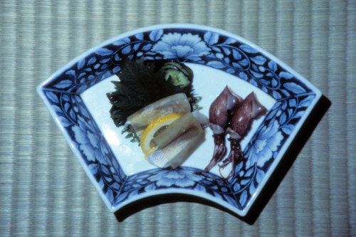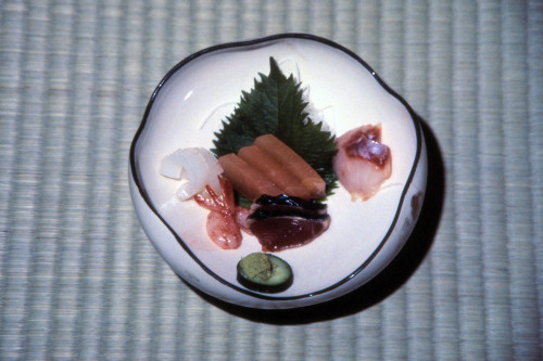 ![]() A typical carefully presented individual dish (most times including raw fish) - and below |