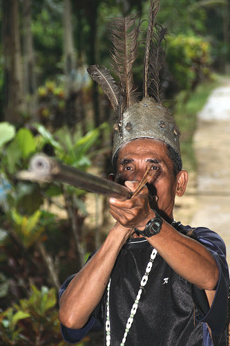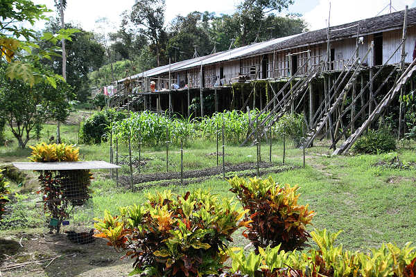 ![]() An Iban tribal "longhouse" - this one consisting of 21 joined family units each of several rooms at the back each opening into one very long family room with a balcony at the front |