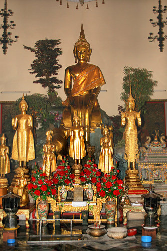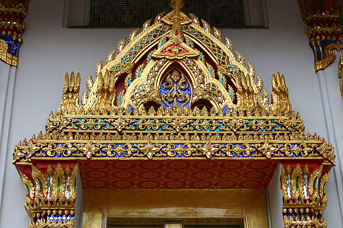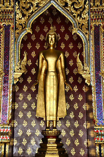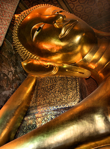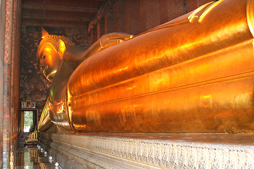 ![]() The gold plated reclining Buddha is 46 meters long and 15 meters high, and is designed to illustrate the passing of the Buddha into nirvana. The feet and the eyes are inlaid with mother-of-pearl. |