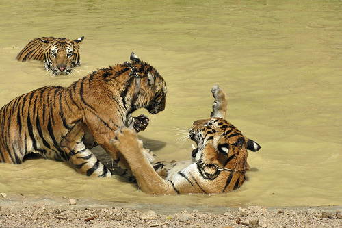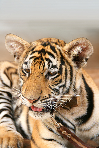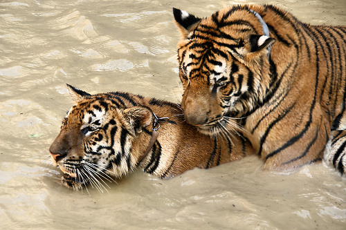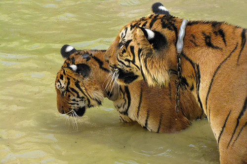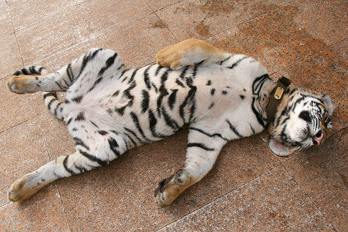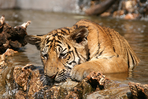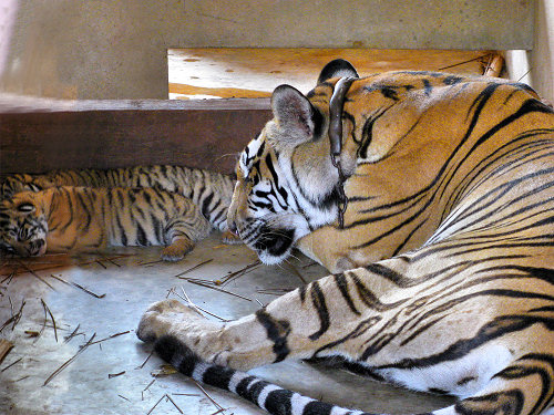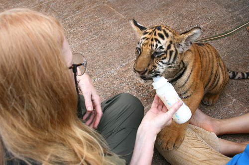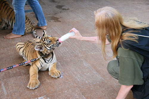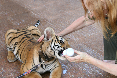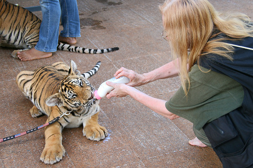 ![]() Carole-Anne helps to bring the youngest tigers to breakfast and afterwards to play in a pool |