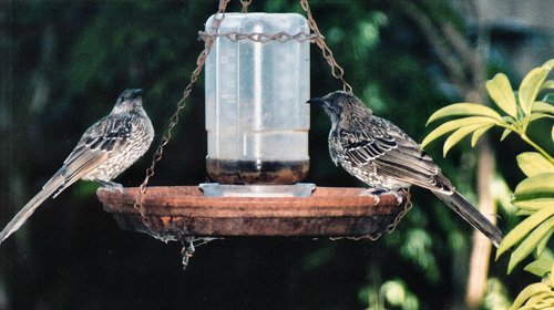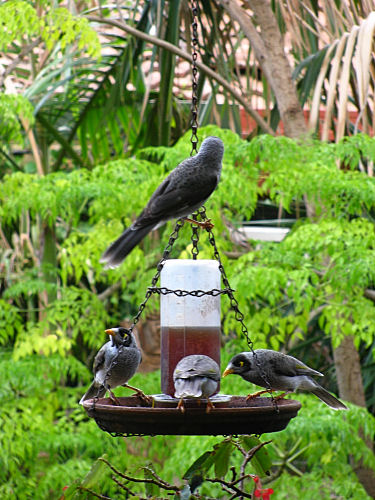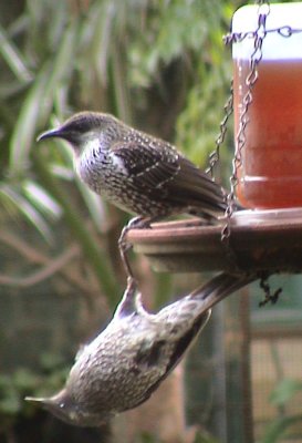 ![]() The Red Wattlebird chases the other birds off the nectar feeder - including the usually aggressive Noisy Miners |