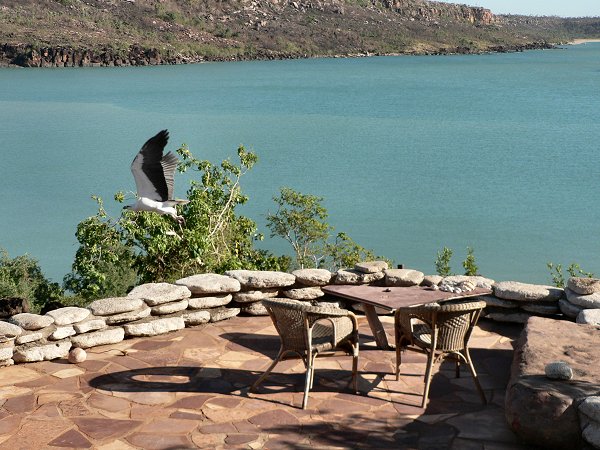 Sea Eagle swooping for meat placed on table outside lounge/dining area