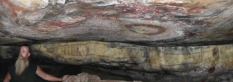 Our guide Rocky shows us this amazing snake, one of the many diverse paintings in this large cave complex