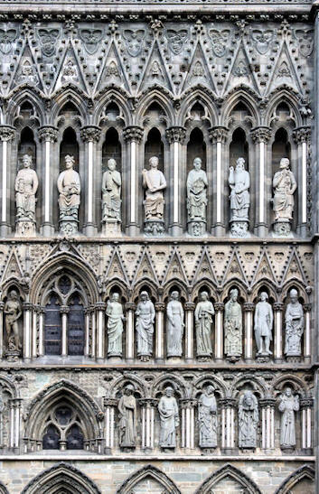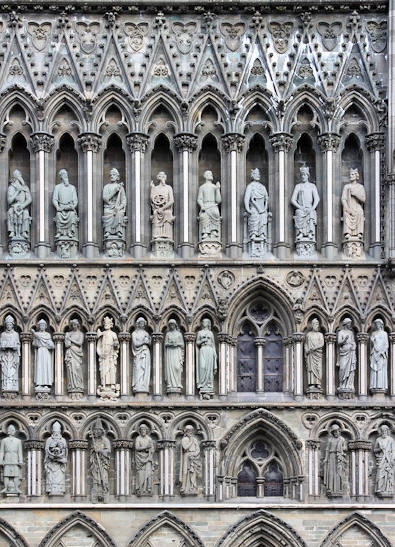 The Church of Norway's Nidaros Cathedral. Built as a Catholic church in the 11th and 12th centuries, it became Lutheran in 16th century. ![]() The detail work on the west face (above) is amazing - see below |