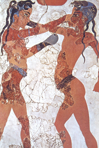 ![]() This Minoan Fresco was unearthed in the Bronze Age town of Akrotiri, situated on the island of Thera, now known as Santorini, just north of Crete. The town of Akrotiri was buried suddenly, around 1,540 BCE, in a huge volcanic eruption |