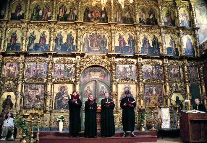 ![]() Singers entertain the tourists in front of the Cathedral iconostasis |