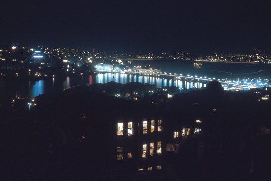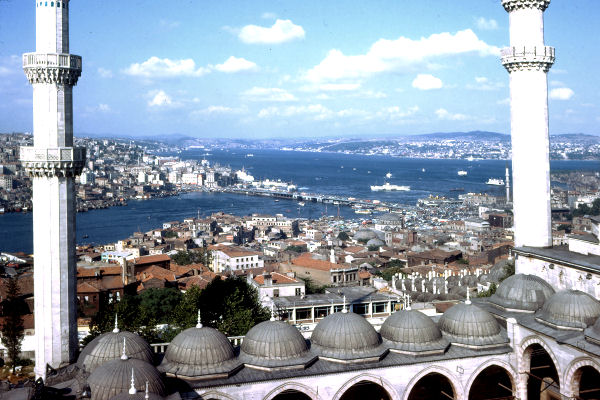 ![]() Looking SE from above the Suleymaniye mosque we see the Bosporus narrow water channel mid-left joining the Black Sea to the Sea of Marmara towards the background of the picture with mainland Turkey in the background |
