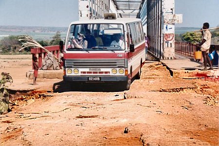 Our tour bus crosses the rickety bridge over the River Mandrare - note the state of a typical road (and note the intrepid photographer in the front seat of the bus) |