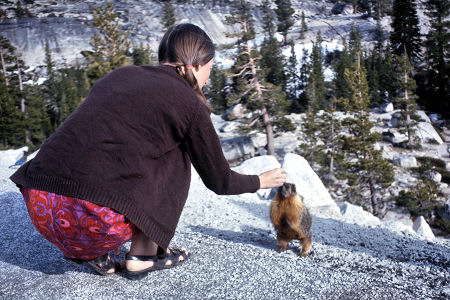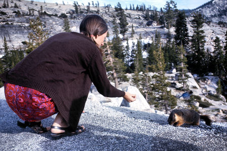 ![]() Approaching Upper Yosemite we entice a wild Marmot with food |