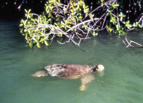 ![]() A Green Sea Turtle in the coastal mangroves of Santa Cruz |