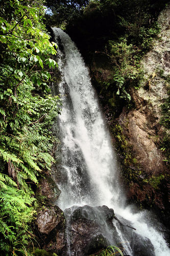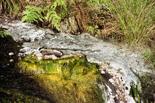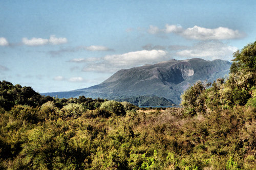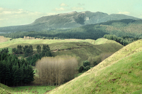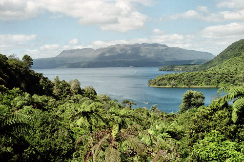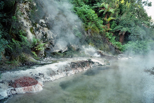 ![]() The volcano Mt. Tarawera in the background blew its side off in 1886 covering the surrounding area in lava and ash. The hole in the side of the volcano can be seen more clearly in the closer views below. |