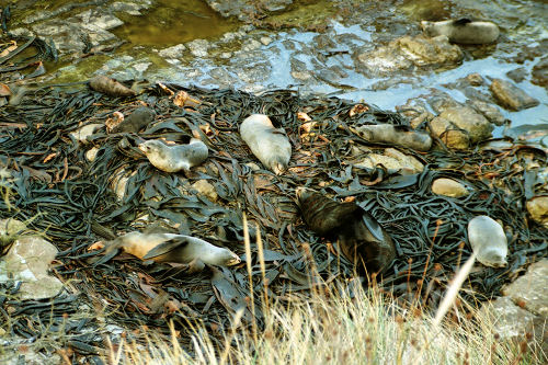 ![]() Fur Seals camouflaged in the seaweed and rocks |