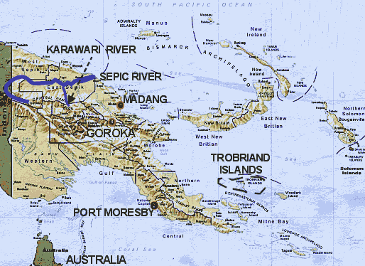 Along the Sepic River Mendam + Tanbanam + Yentchen Aibom + Palembei + Kanganaman + Timbunke Karawari River Amboin Konmei + Tanganebit + Yimas Ambon Wari + Binum + Kundimun + Simbud The Highlands Mount Hagen and Kotna Goroka Goroka Highland Show 1984 30 ceremonial costumes on display Other Crafts
